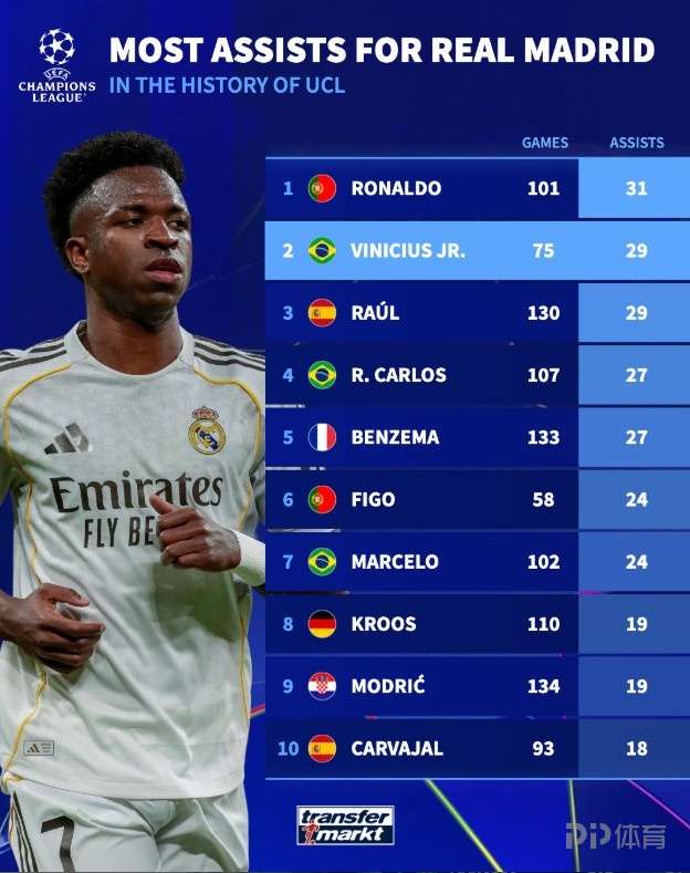 皇马欧冠助攻榜:C罗31次居首 维尼修斯29次并列第二